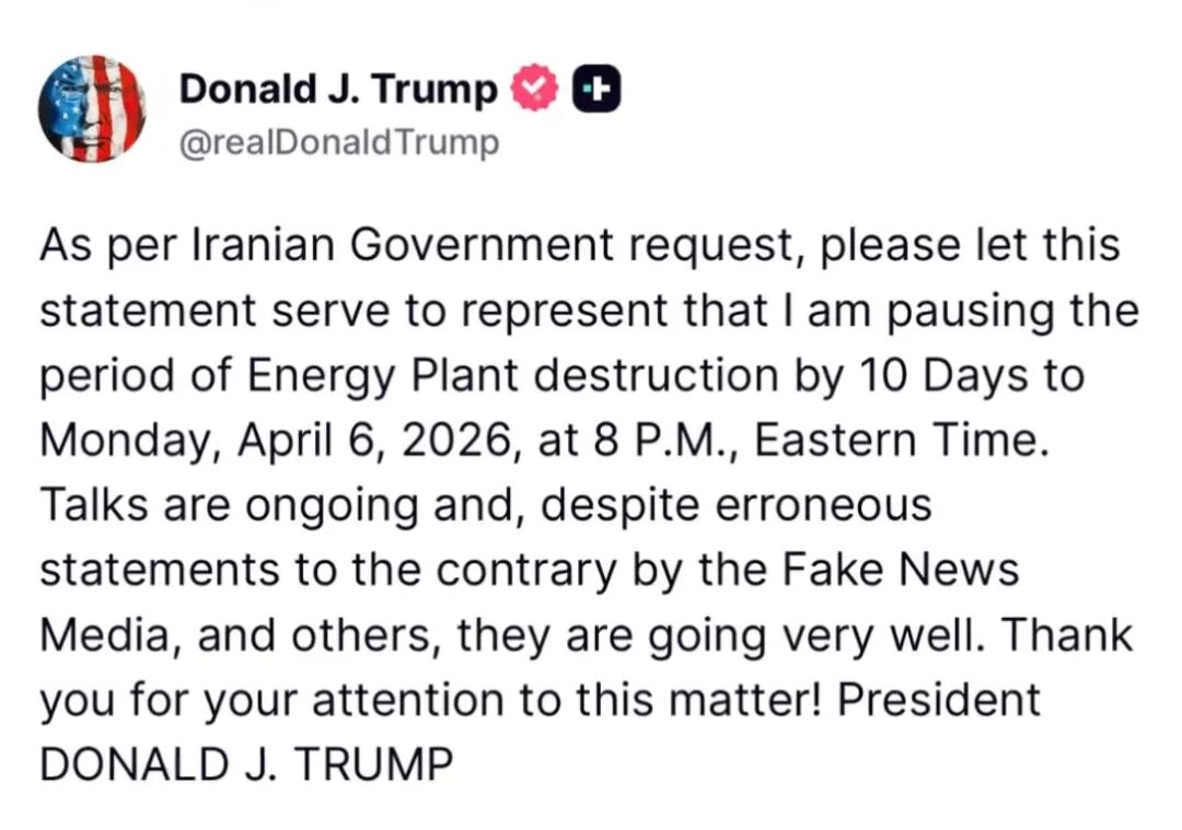 这听起来有些绕。总之,他再次宣布将把对伊朗能源设施的打击暂停期延长10天,暂停至4月6日,因为与伊朗的谈判“正在进行中”且“进展非常顺利”。
